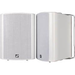 This Dayton Audio all-purpose 2-way speaker system is perfect for a deck or patio and is ideal for use as home speakers. They feature a 5-1/4 polypropylene cone woofer with a rubber surround and a 5/8 polycarbonate tweeter to produce smooth detailed sound. Wet or dry these speakers are ready to perform. The weather-resistant ABS speaker cabinets and painted aluminum grills provide protection for use outdoors under an awning or soffit (not in direct contact with rain or sun). Includes U style brackets, mounting hardware and gold plated 5-way binding posts. They are also available in both white and black to easily blend into any decor. Specifications: *5-1/4 Polypropylene woofer with rubber surround *5/8 polycarbonate tweeter with ferrofluid *Frequency response: 70-20,000 Hz *4 ohm impedance *Power handling: 50 watts RMS/100 watts max *Sensitivity: 89dB 1W/1m *Threaded brass inserts for use with swivel type speaker brackets *Dimensions: 9-11/16 H x 7-1/16 W x 6-9/16 D *Mfg. ##IO520W *Sold in pairs.